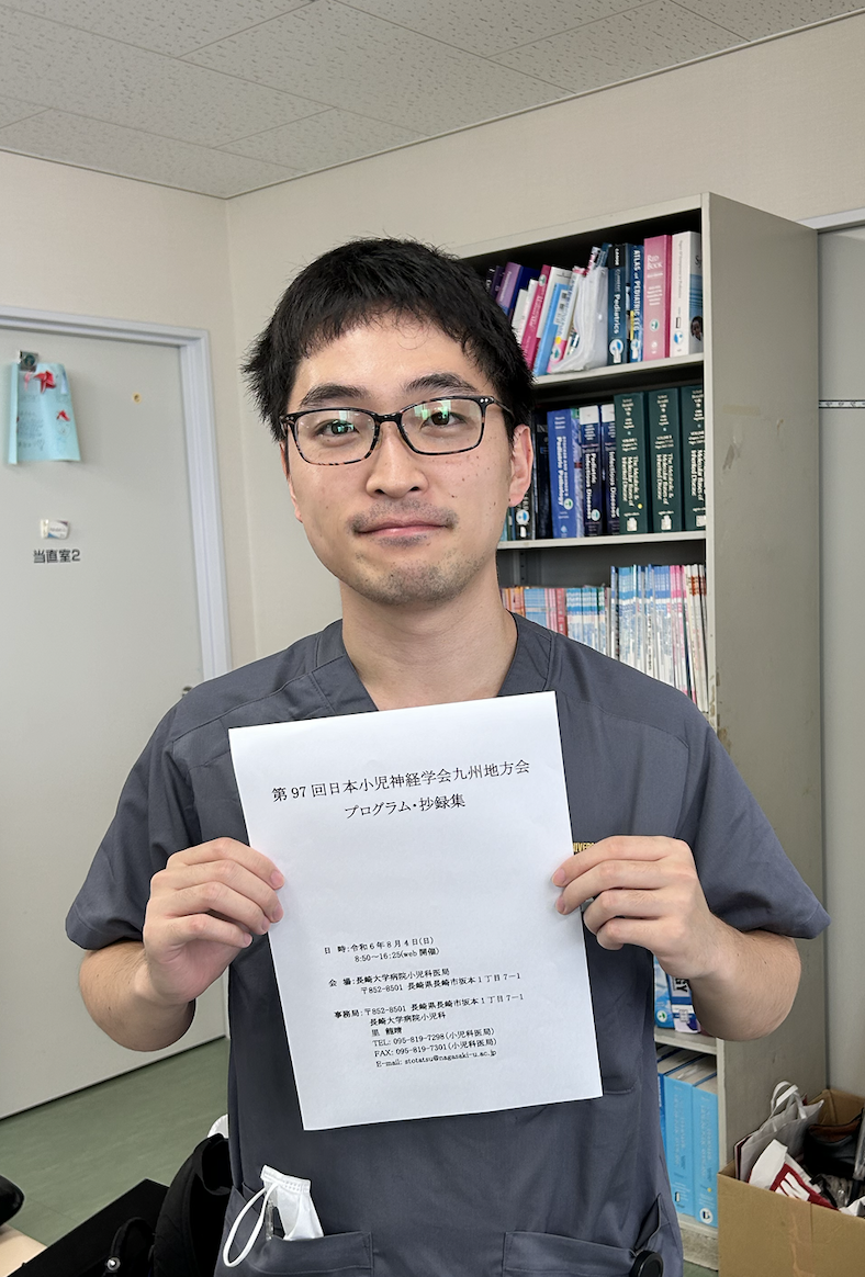 2024年8月4日行われた日本小児神経学会九州地方会がwebで行われ、今年度入局の金堂円太郎先生が堂々とした発表を行いました。新人ながら、その内容は非常に充実しており、聴衆からも高い関心が寄せられました。発表は、明瞭かつ論理的で、複雑な内容もわかりやすく説明されていました。その姿勢と努力は、まさにこれからの医療界を担う若手の模範となるものでした。